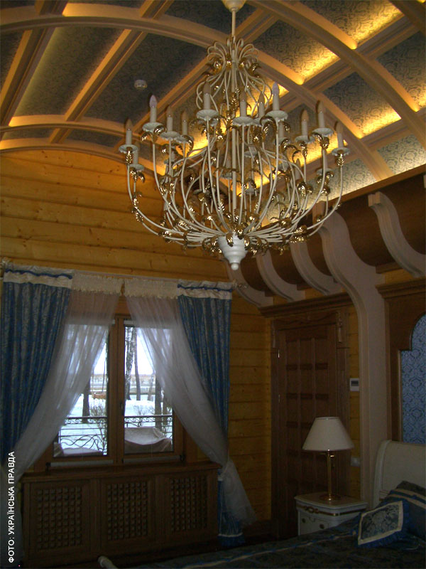 "Теперь в сеть попали снимки интерьера. Глядя на эту роскошь, учтите, что имение находится в глухом лесу, а сам Янукович пользуется им крайне редко. Особого внимания в доме заслуживает потолок. По словам столяра, один лишь потолок внутри "охотничьего дома Януковича" был оценен в 5 миллионов гривен - правда, по его словам, выполнен он был некачественно, а некоторые элементы начали портиться", - пишет издание.